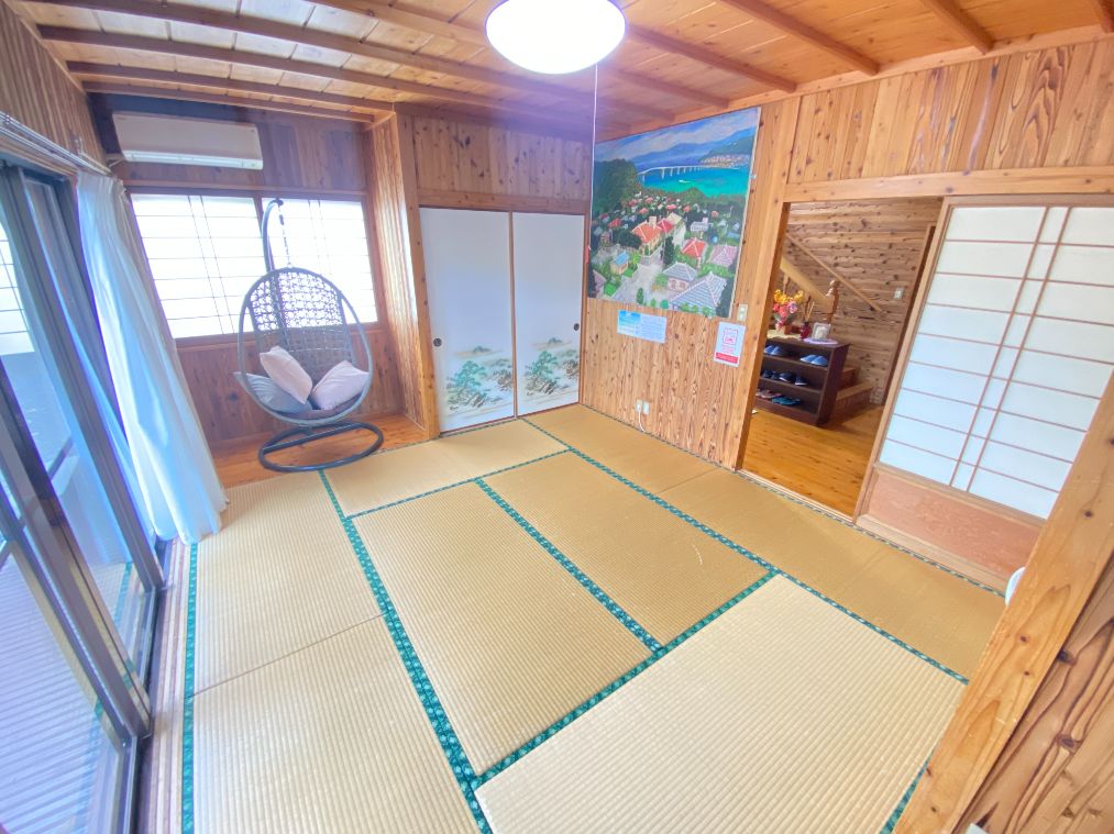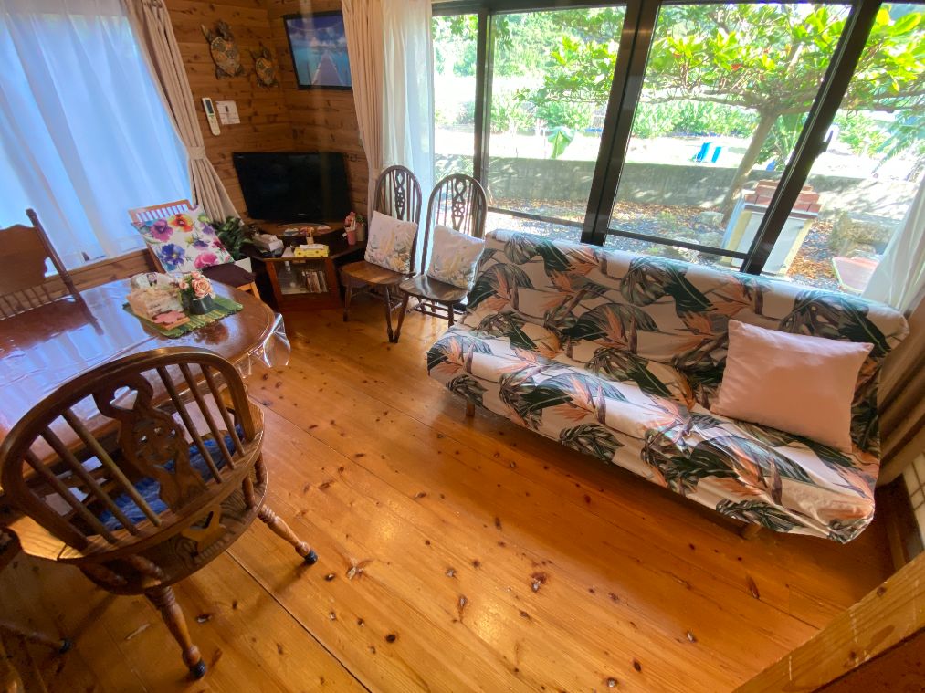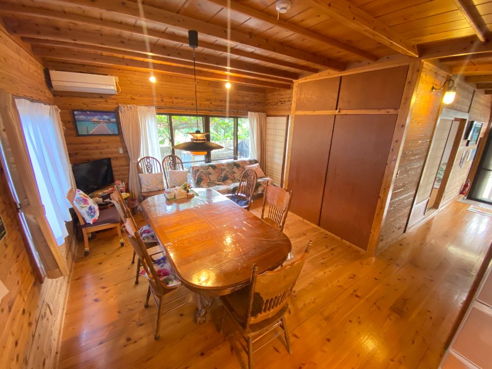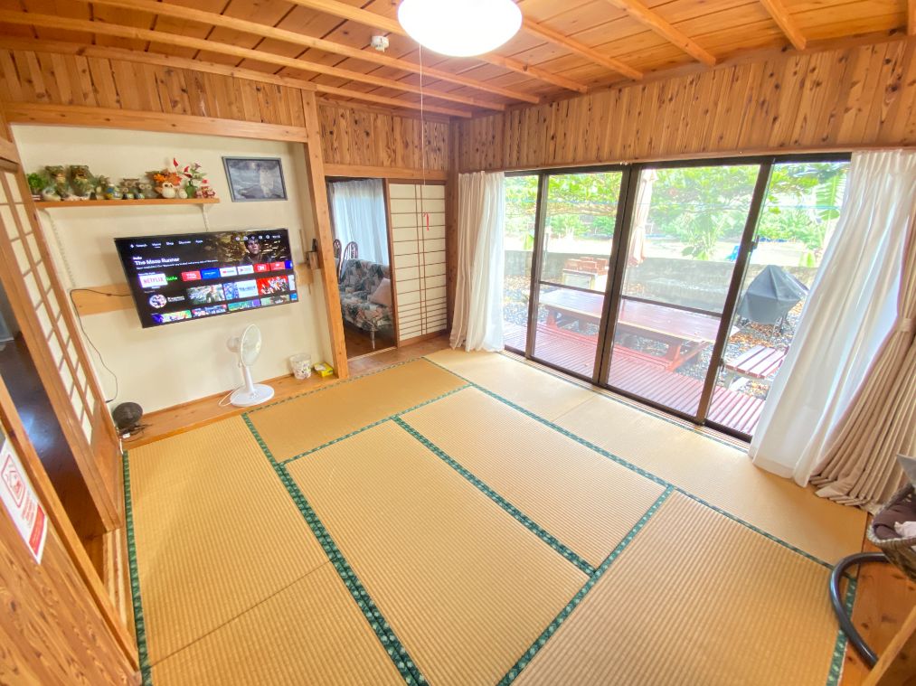 観光に人気の沖縄県北部の恩納村の南エリアに位置しています。ビーチまで徒歩1分、ダイビングスポットの「真栄田岬・青の洞窟」やアドベンチャー施設まで車で数分の場所にあり、ミンサーの柱と赤瓦屋根が目印の2階建一軒家です。 内装は、壁や天井を山小屋風にデザインして、所々に沖縄を印象付ける仕上がりになっています。 琉球石灰岩で作られたテーブル・イスでくつろぎながら、広い庭でBBQをして、ご家族・親戚やお友達とゆっくりと沖縄の日常を楽しんで下さい。 レンタカーなら那覇空港から国道58号線を北上して約1時間、バスの場合は県道6号線のバス停「美留」より徒歩30秒です。沖縄の移動は、レンタカーがおすすめです! !